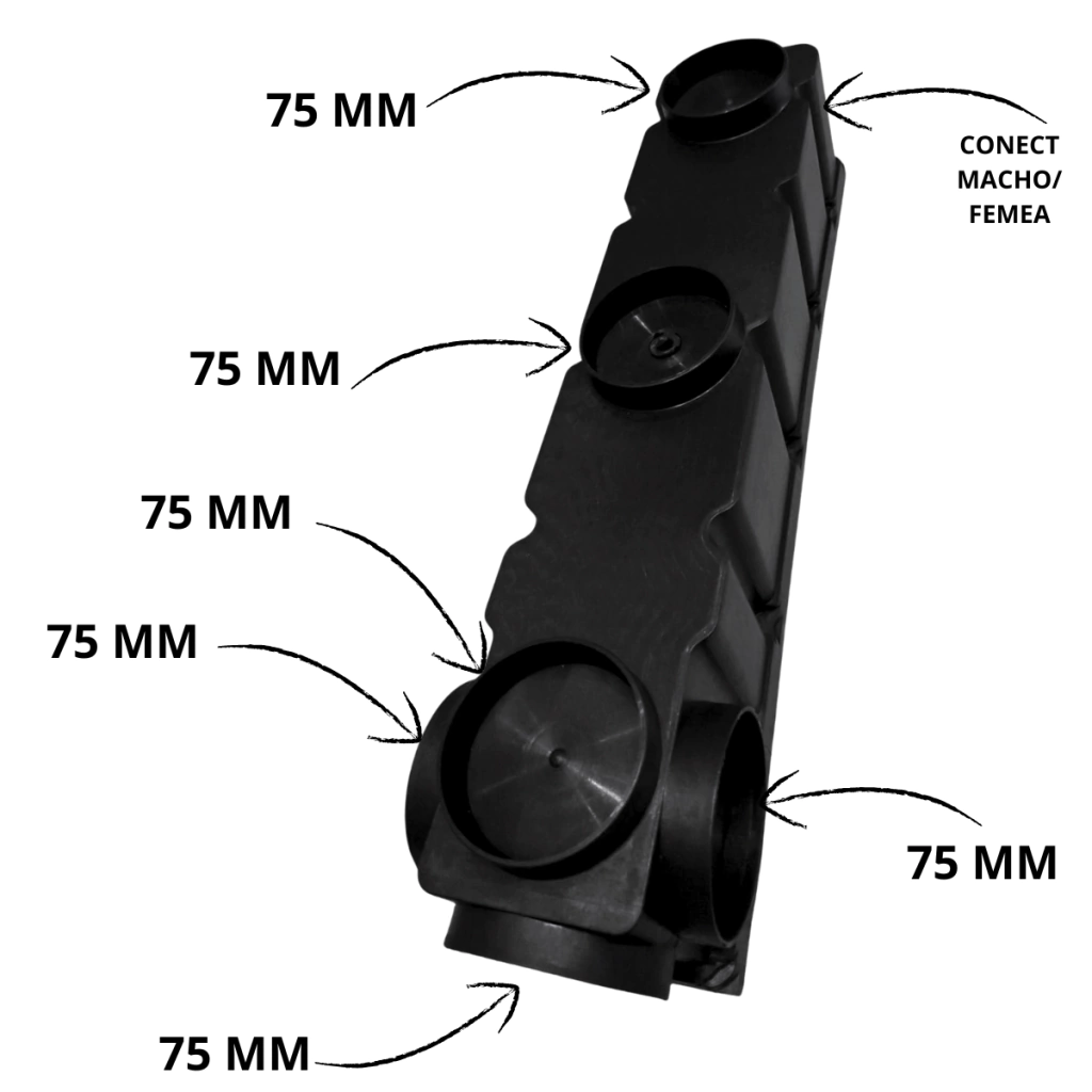 Proporciona maior facilidade para os projetos de drenagem de águas pluviais, coletor com sistema conect sequencial para tubo de 75mm não precisa de outras conexões para formar a medida que precisar (de 50cm em 50cm).